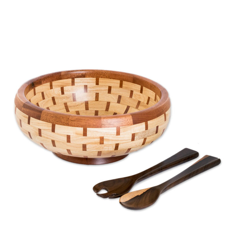 Backed by our 100% Happiness GuaranteeRevolutionize your meal presentation with Hugo Pena's eco-conscious salad bowl creation. This visionary Guatemalan craftsman rescues premium wood scraps, skillfully piecing them together to form a functional work of art. The bowl's complex patterns, born from a fusion of mahogany and palo blanco, reflect his dedication to reducing waste while elevating craftsmanship. Accompanied by a serving spoon and fork, this set invites you to savor both your salad and the beauty of responsible design.