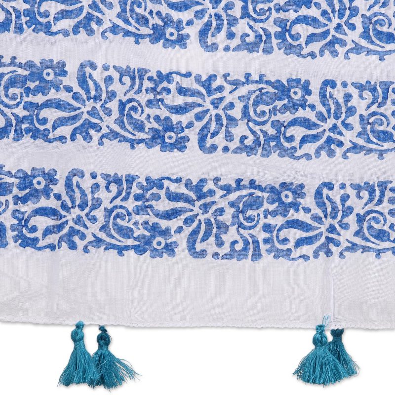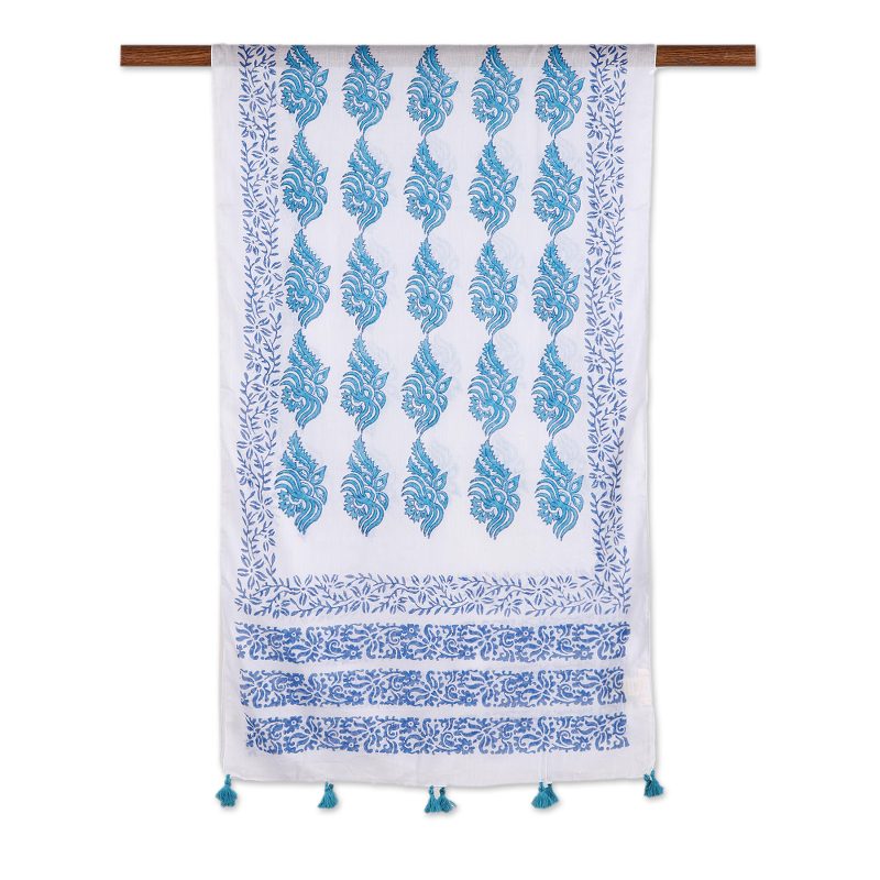 Against a body of pure white, turquoise flowers are framed by simple floral motifs of lapis. Indian duo Rajnandinee and Srabonti design this cotton scarf, which is decorated using the time-honored block printing technique. Lovely turquoise tassels dangle from each end.
