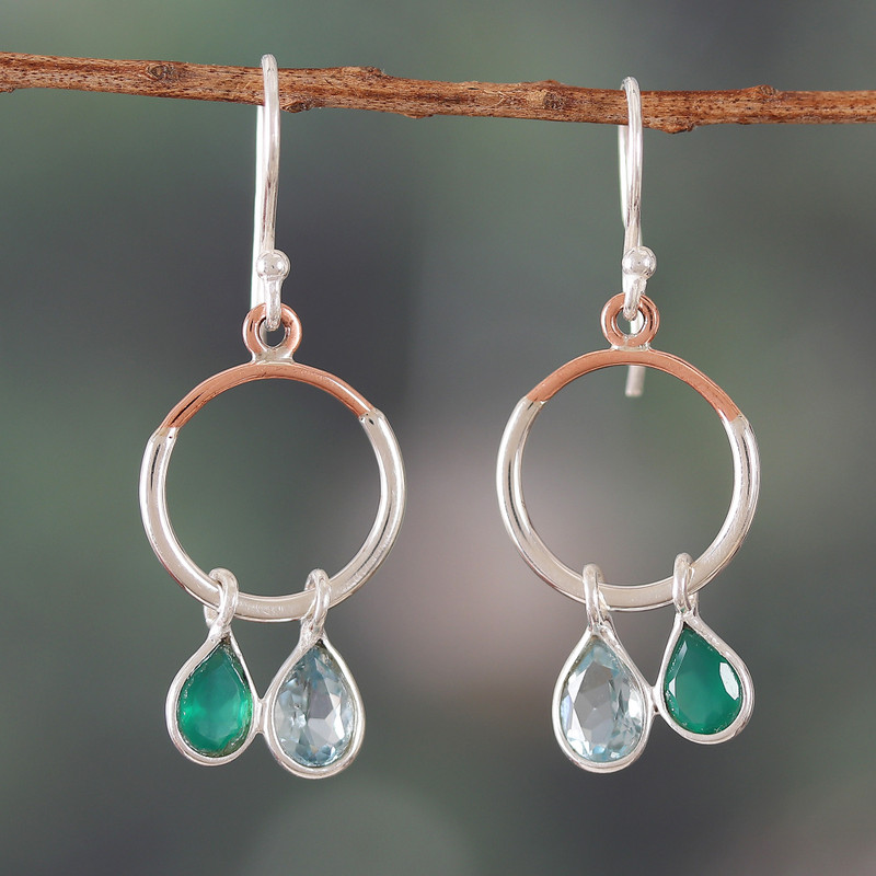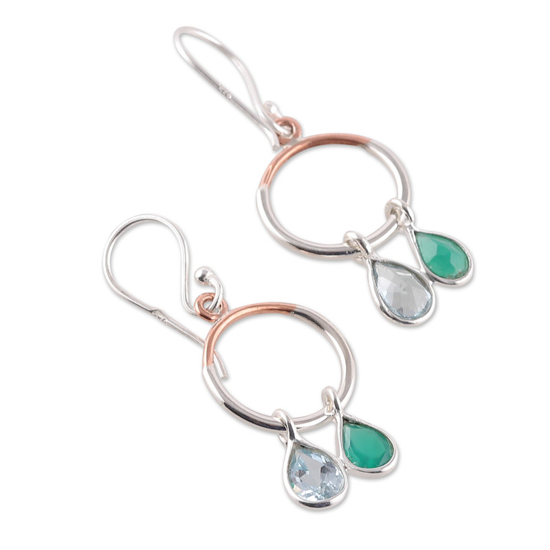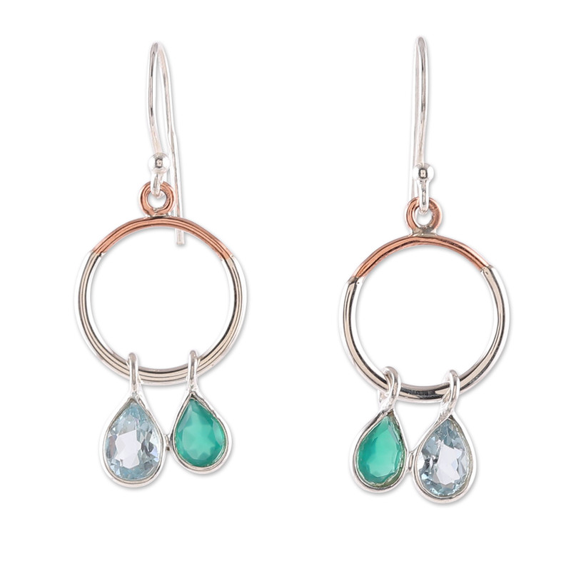 A dance between wisdom and serenity creates a harmonious aura around these dangle earrings presented by Bhavesh. A team of master Indian artisans works with sterling silver and copper to craft these sublime accessories, whose round structures are enriched by green onyx and blue topaz jewels, totaling two carats and shining with enchanting light.