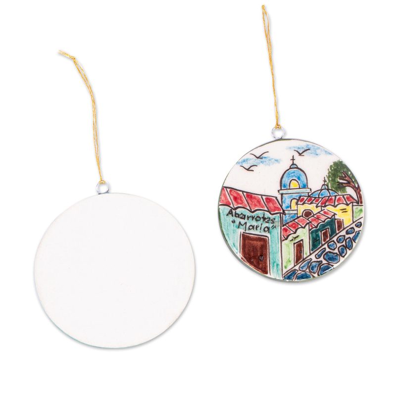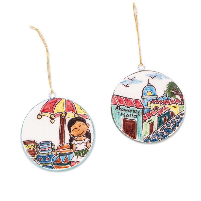 Ceramic disks depict vignettes from everyday life in Mexico. Crafted and painted by hand, these ornaments convey a nostalgia for neighborhoods and small town life. Eleazar Leal depicts a girl selling clay jars in an open-air market and a cobblestone street where a small mom-and-pop store sells abarrotes — groceries of all kinds. The church on the plaza can be seen in the background.
