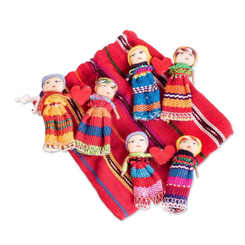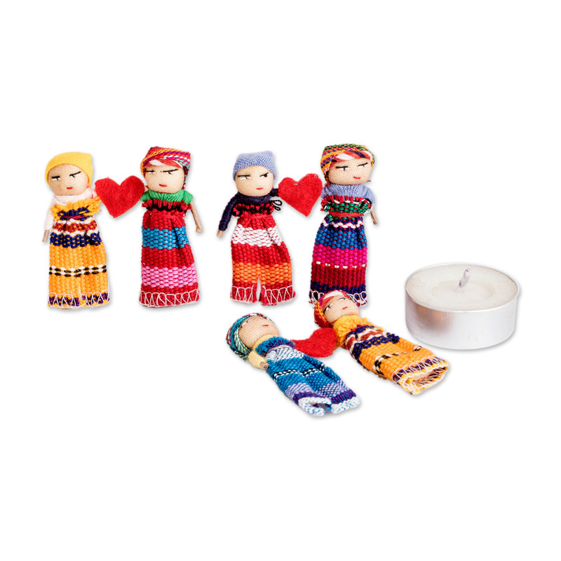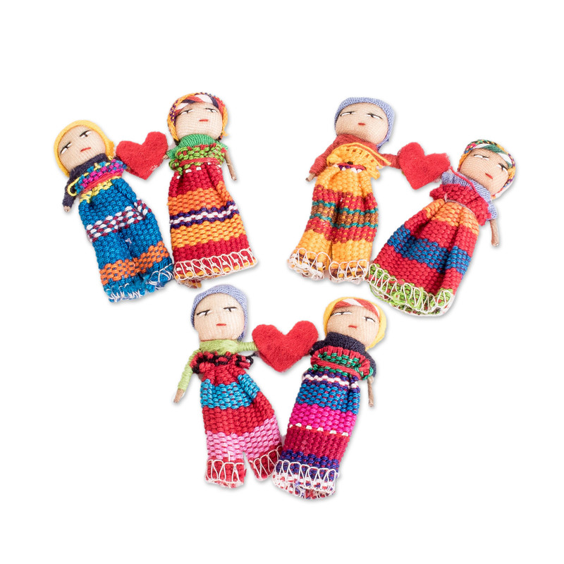 Crafted by members of the Lopez Garcia Family of Guatemala, these quitapenas dolls make a wonderful gift for friends or family that tells the recipient you care about their well-being and wish them the best. Quitapenas means "to remove worries" in Spanish; artisan Aura Lopez explains the Mayan worry doll tradition. "My grandparents said that the way to use them was to take the doll out of the bag or wooden box and tell it your problems and fears," she states. "Then, you place the doll under your pillow and, the next day, your problem becomes smaller or can be resolved." The set consists of two pairs of male and female worry dolls joined together by a red heart. Handmade, the dolls are dressed in vividly-colored traditional Guatemalan attire and arrive in a pouch of handwoven cotton fabric.