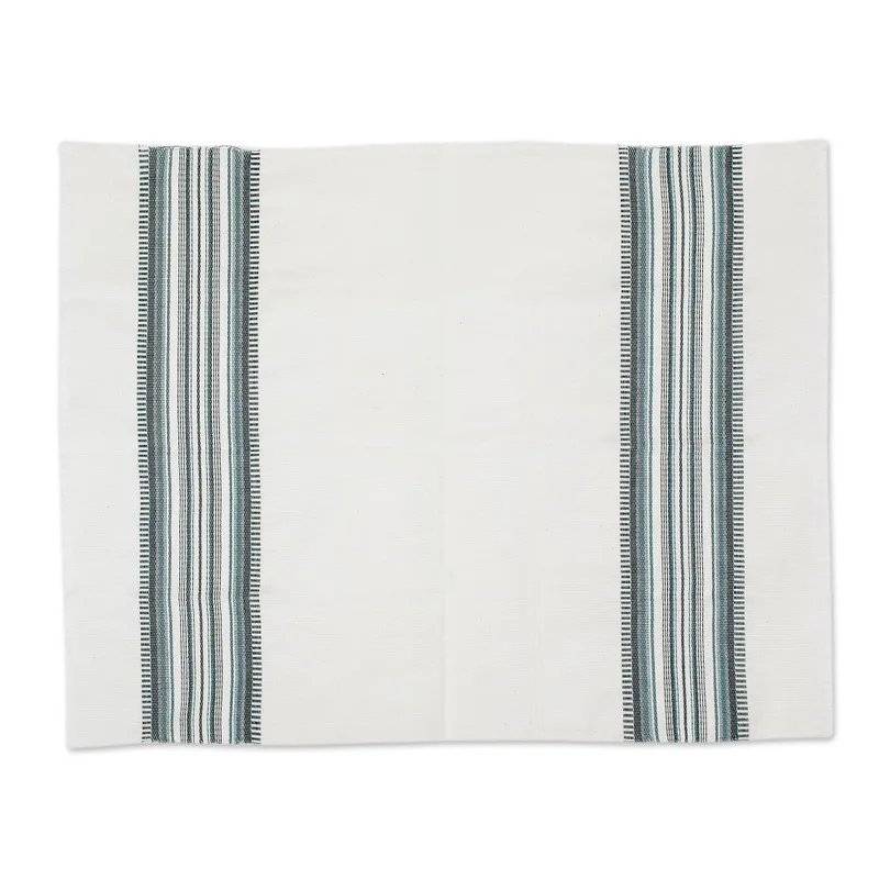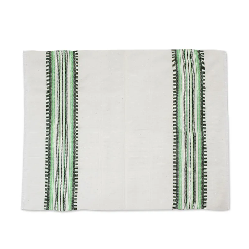 Woven by hand, these white cotton dish towels feature bands of cool forest colors. Their generous size and soft textures make them a must in the kitchen. Eladio Chiroy works on a traditional floor loom, adorning one with teal tones like evergreens in the shade and the other in cheerful grass greens. The natural colors are derived from seeds, herbs, tree bark and woods.