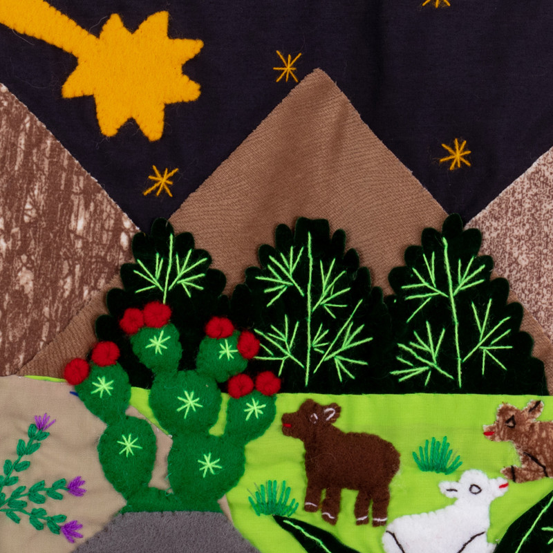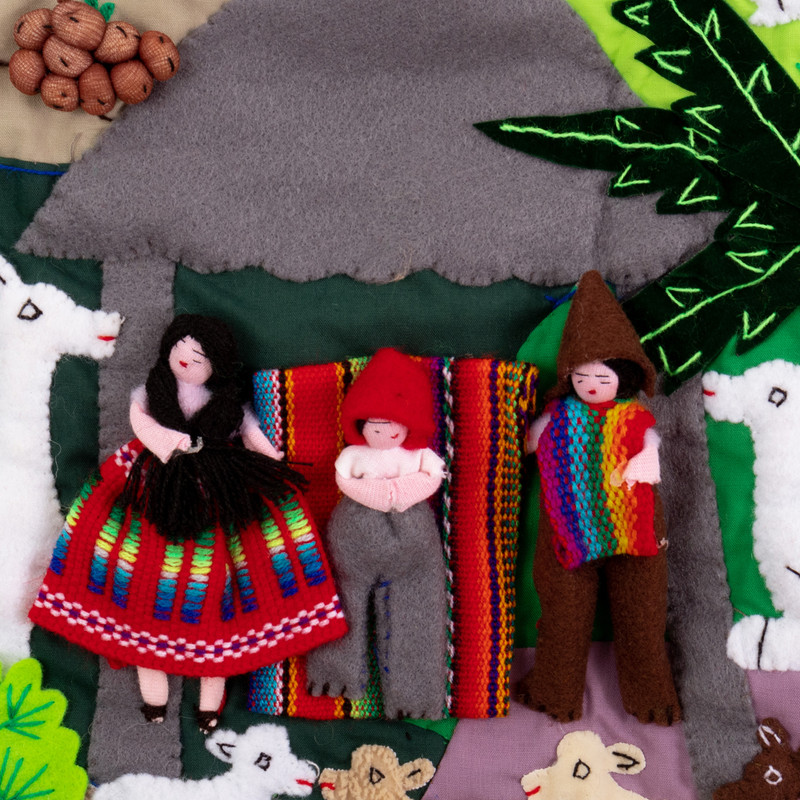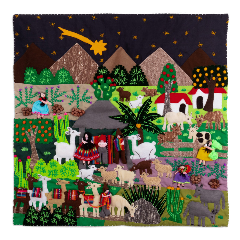 The Christmas star blazes through the heavens on a quiet night in the Andes. It illuminates a nativity scene with a Peruvian setting. Leonor Quispe gives an Andean setting to the very first Christmas. She works in the traditional art of arpillería (patchwork) to create this extraordinary wall hanging. Each tiny figure is crafted in three dimensions and lavishly embroidered.