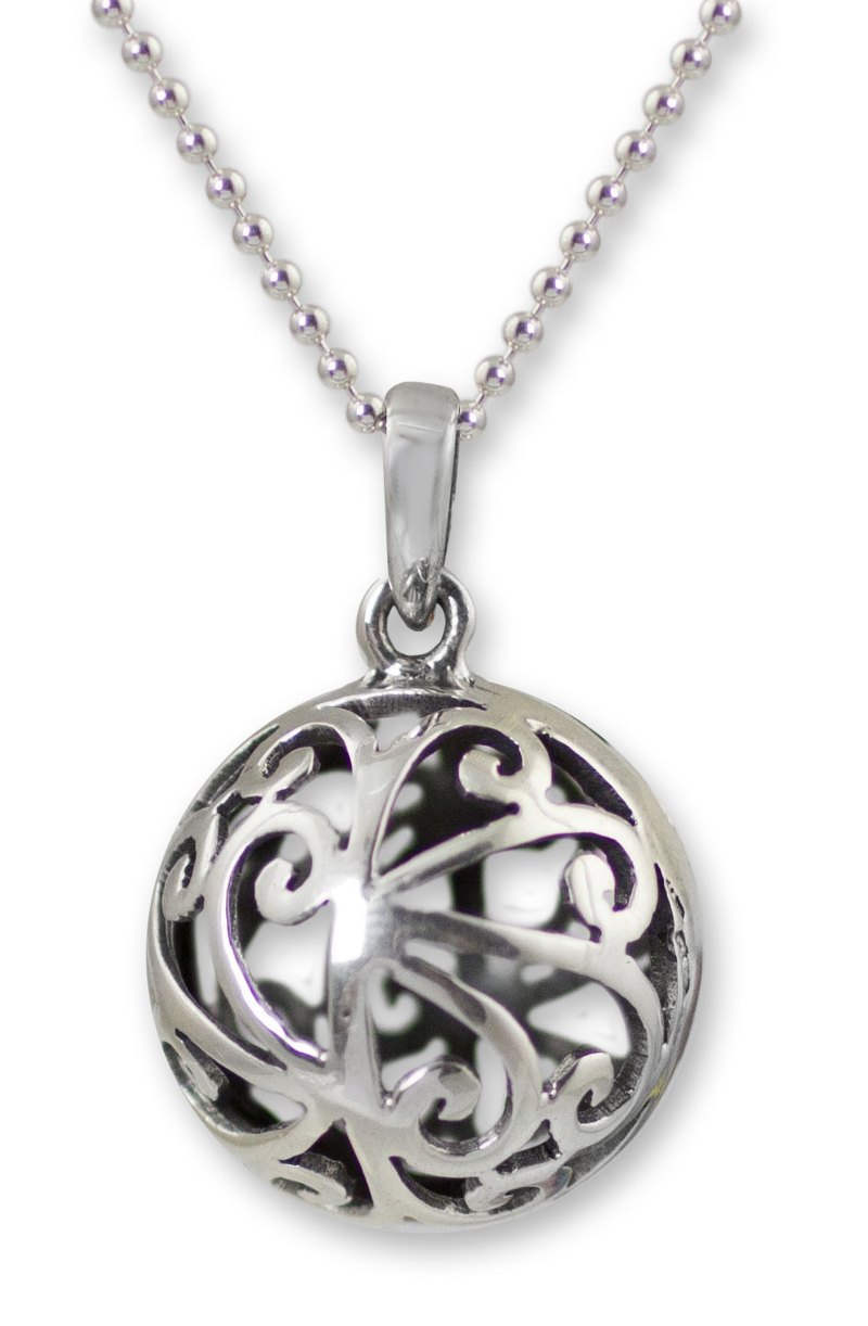 Like a floral disco ball, a hollow globe of shining silver hangs from a sterling chain. This joyous necklace from Aoy evokes rain forest vines.