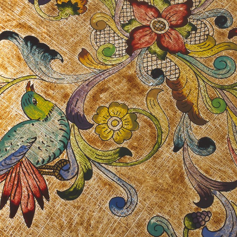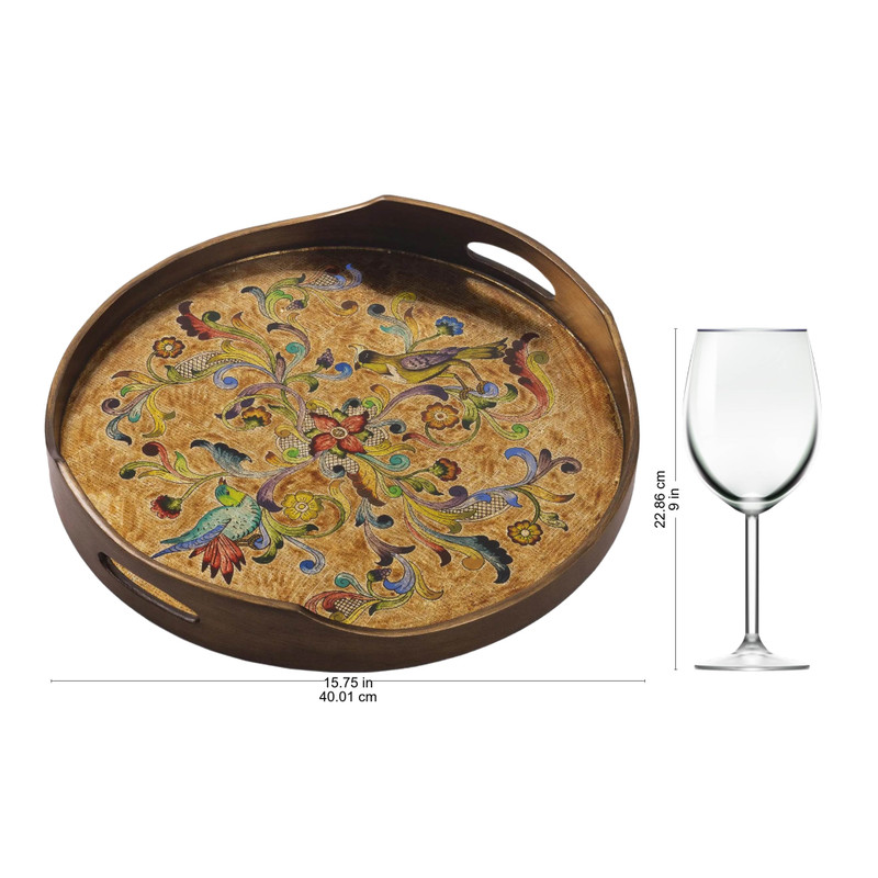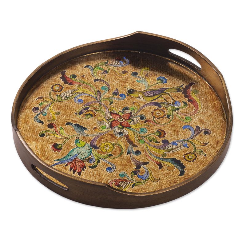 Peru's Asunta Pelaez works in the time-honored art of reverse-painted glass to create this beautiful tray. The colorful bird and leaf motifs are painted on the reverse side of a round glass pane before it is set into its wooden frame. The frame's antiqued gold finish complements the design nicely.
