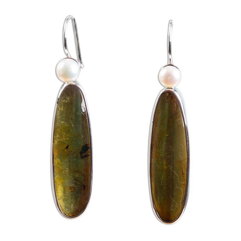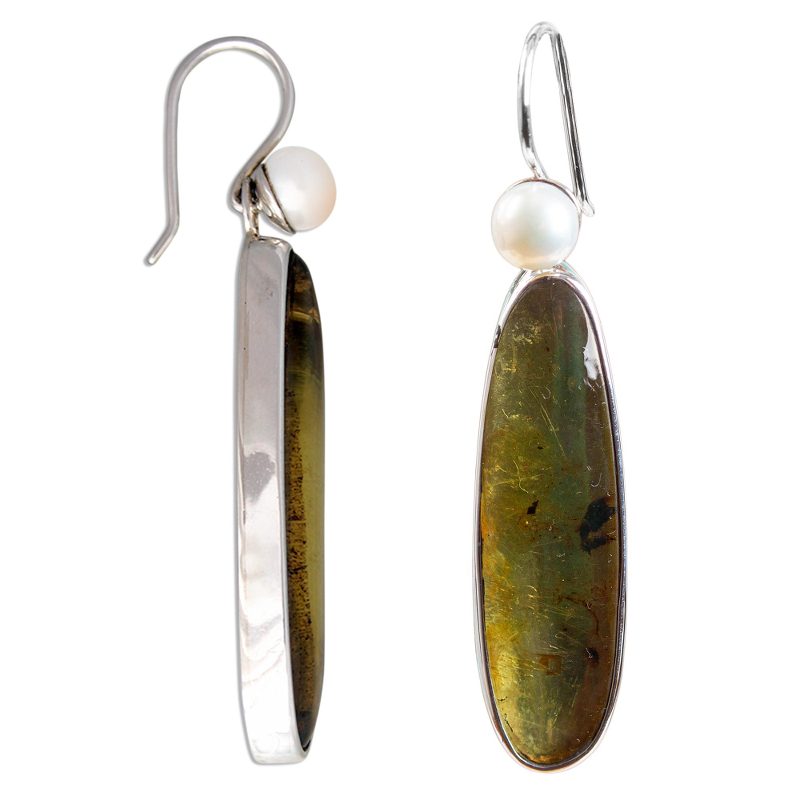 Sunny droplets of amber enclose mysterious shadows. Clasped in a sterling embrace, they dance beneath lustrous pearls. Guillermo works with silver mined in Taxco to create these lovely earrings.
