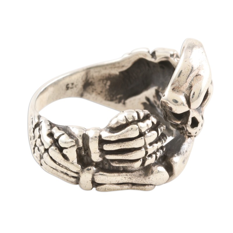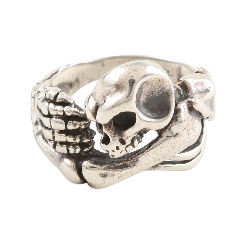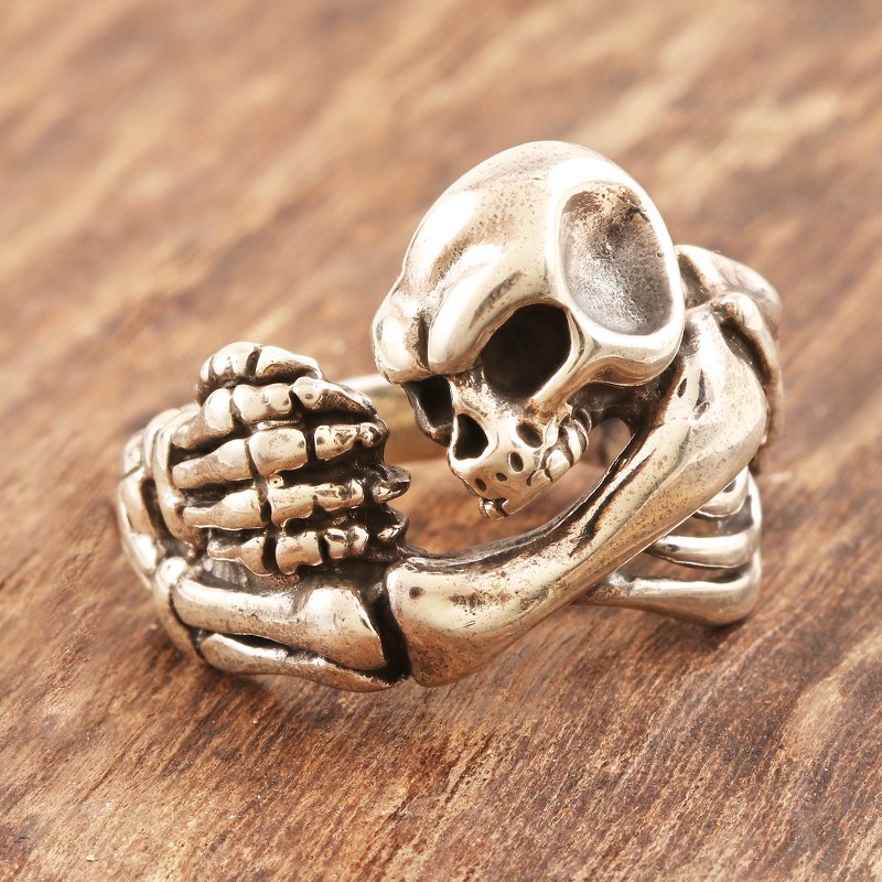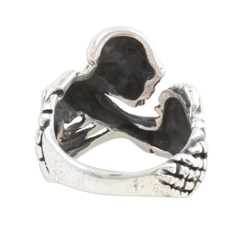 With bony fingers and hollow eyes, a grinning skull wraps its arms around the beloved in an eternal embrace. Ajay Patil designs this unique ring for men and women. It takes shape in finely-detailed sterling silver.