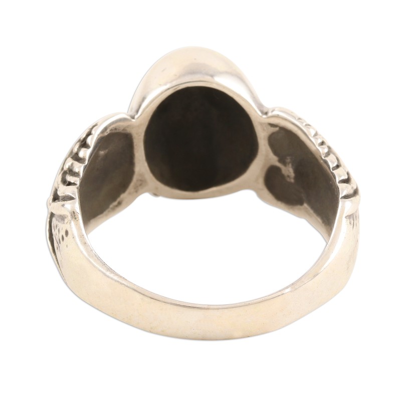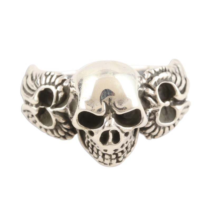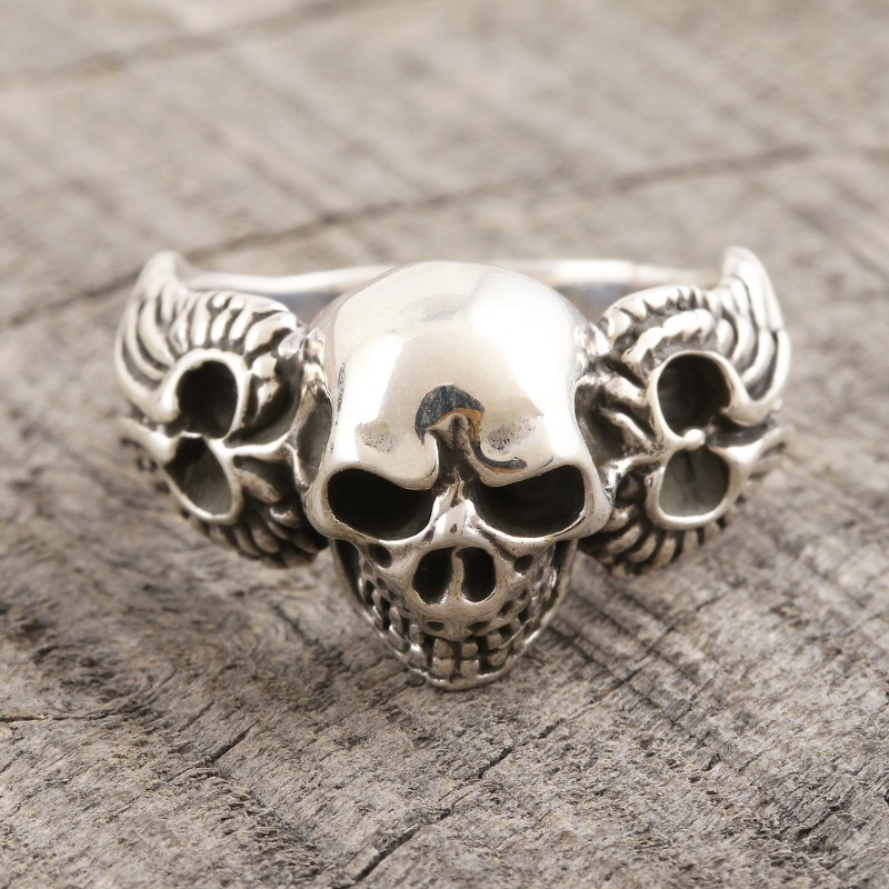 A scowling skull comes to life in sterling silver to center this bold ring. Favored by many motorcycle enthusiasts, the winged skull represents the fleeting brevity of life. Ajay Patil designs this unique skeleton-theme ring for men and women.
