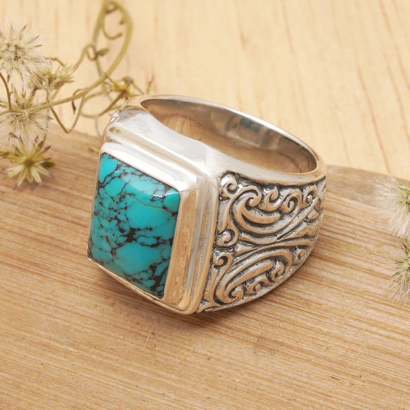 Sterling clouds frame blue skies, forming patterns of florid beauty. Nyoman Rena replicates classic Indonesian artistry for an elegant silver ring featuring reconstituted turquoise.