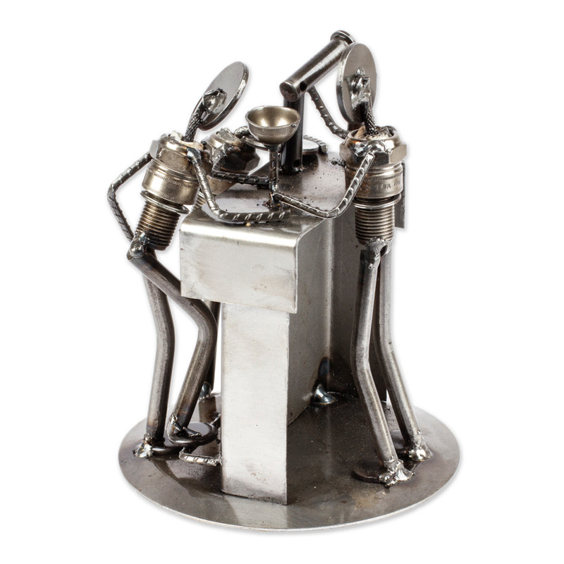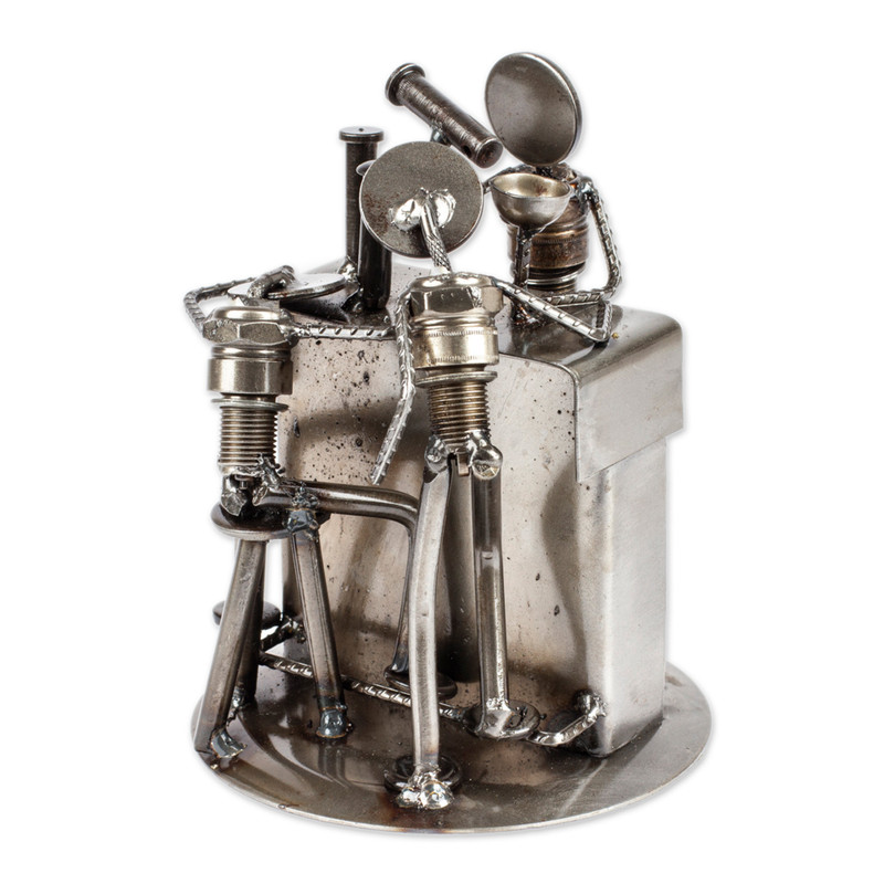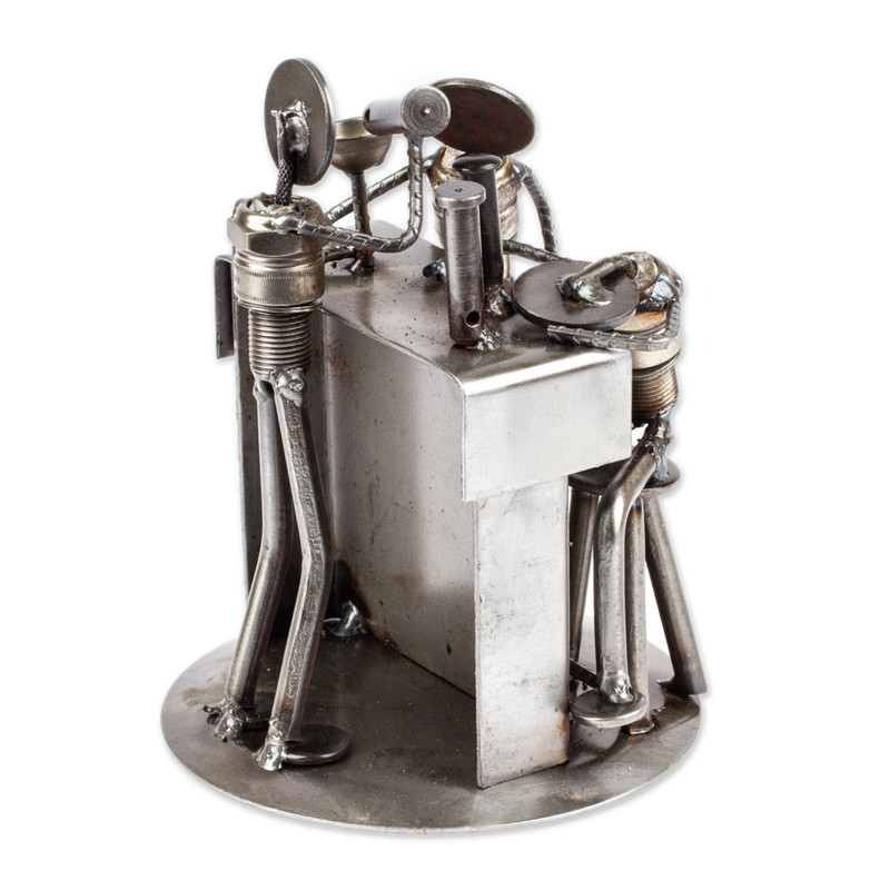 After a hard day's work, friends meet at the cantina (bar) to talk about sports, life, etc. Armando Ramírez captures a scene from everyday life in a sculpture complete crafted with recycled metal pieces. Ramirez uses spark plugs for the bodies, iron wires for their arms and legs, and die pieces for the heads and feet. The glasses are crafted from nozzles taken off blow torches and the bar is sculpted with iron sheets.