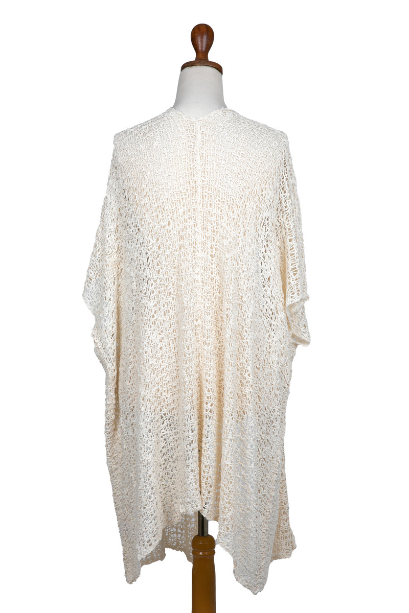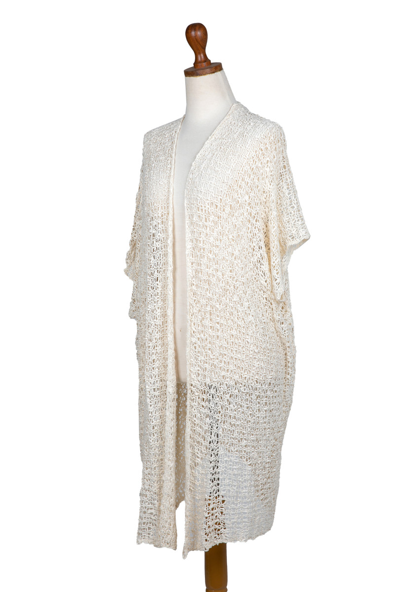 You can find our open knit long kimono 'Ultimate Allure in Ivory' by Novica Collection in clothing categories such as Bohemian Jackets and Coats, Travel Friendly Jackets and Coats and Acrylic Jackets and Coats. Enjoy exploring these sections for other Novica treasures.