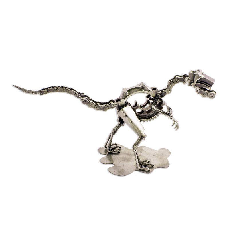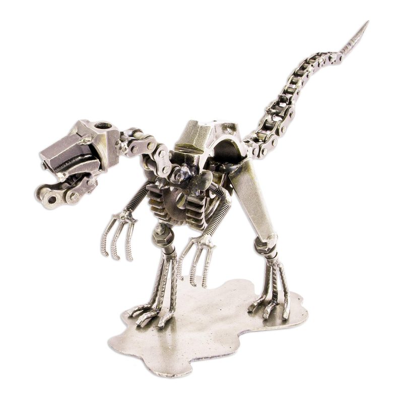Remember that dinosaur that caused such heart-stopping terror in "Jurassic Park"? Here he is, alive and well in the form of a unique recycled metal sculpture. Mexico's Armando Ramirez creates the velociraptor sculpture, working with recycled auto parts and metal scrap. Gears, timing chain and other parts are incorporated into the sculpture, making it an eco-friendly home accent.