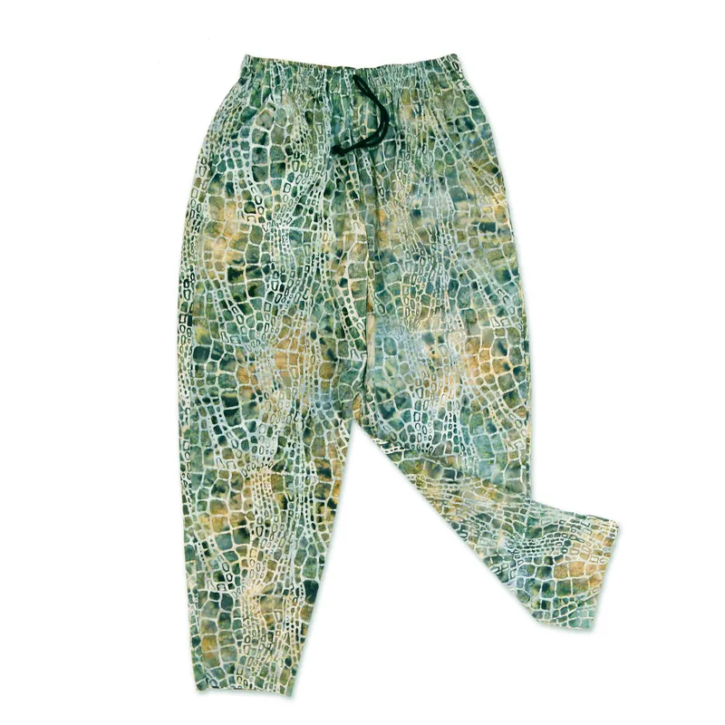 Like pebbles in the bed of a forest river, verdant motifs decorate these cotton pants from Bali. Saktut Raitawati creates these pants, which are meticulously printed by hand using a screen printing technique.