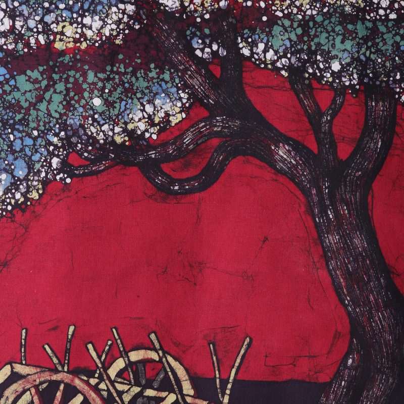 Crops and a flower grow in a field around a tree during the season of spring. Indian artist Siddique creates this beautiful batik wall hanging. Working with cotton, he paints this scene with a wax resist before adding colorful dyes. A plow rests near the tree, framed against a stark red sky.