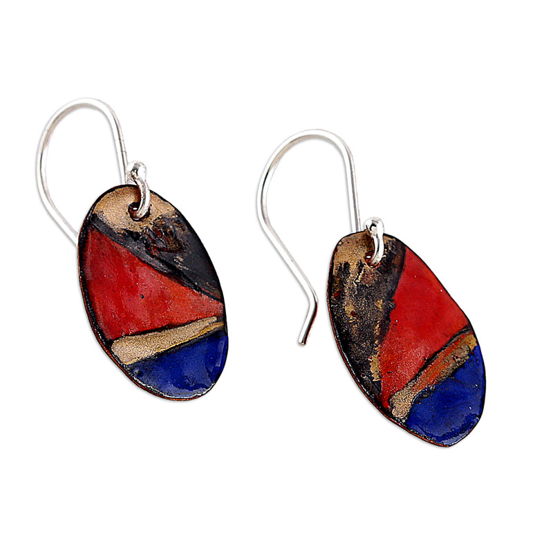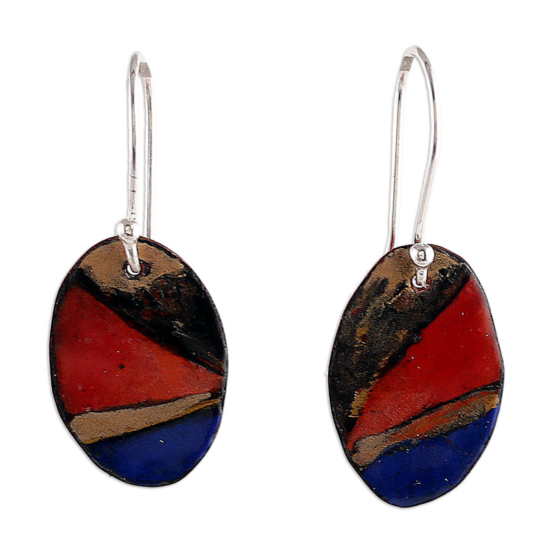Backed by our Happiness GuaranteeThese striking dangle earrings by India's Kavita bring a pop of color with their abstract patterns in vivid blue, gold and red. The powdered glass fused onto copper creates a gleaming vitreous enamel surface that catches the eye while the sterling silver hooks provide a sleek finishing touch—ideal for those who love to stand out with style.