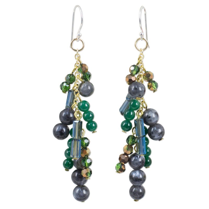 Backed by our 100% Happiness GuaranteeLike a bubbling waterfall, sleek gems cascade down golden chains in this earring design from Nareerat in Thailand. She crafts the earrings with cool labradorite and dyed green quartz as well as sparkling glass beads. The gems adorn 24k gold plated silver chains, which in turn swing from sterling silver hooks.