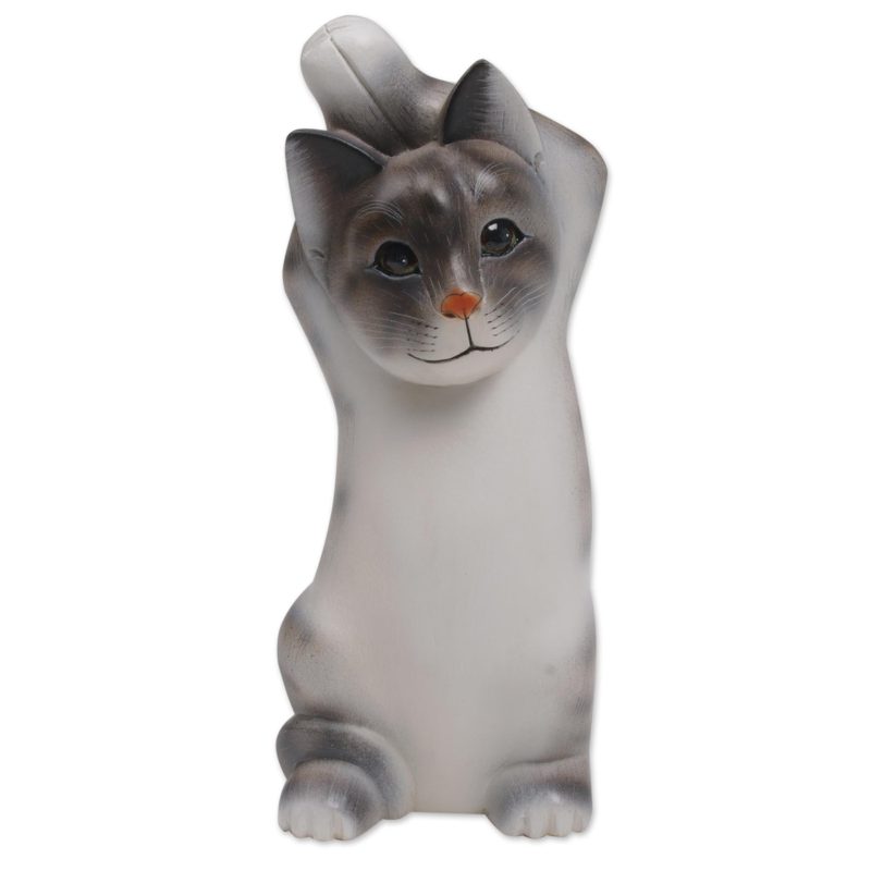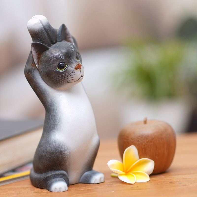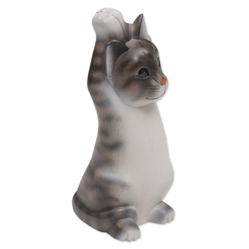 Hand-carved of Balinese suar wood, a cat raises its paws to the sky with joy. Nengah Sudarsana designs this sculpture for a charming addition to any home, painting the cat with colors of grey and white.