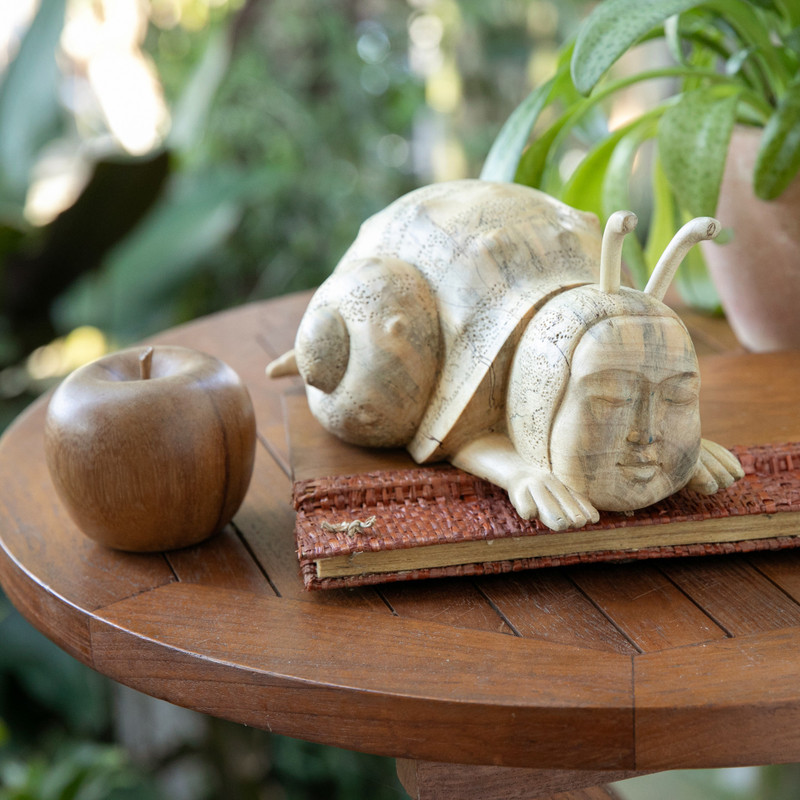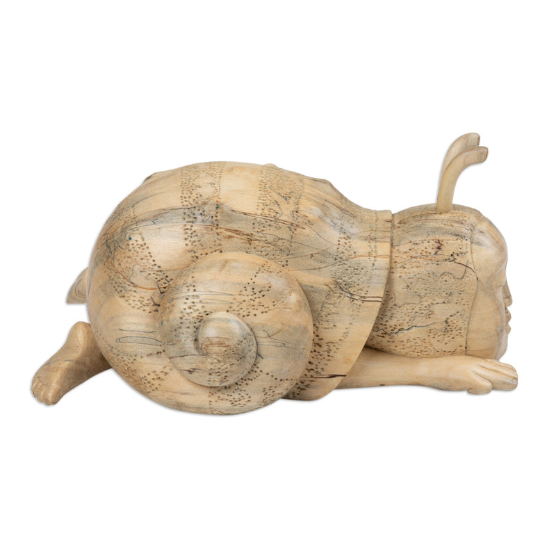 Infuse your home with whimsy and surreal charm through Wayan Rendah's mesmerizing sculpture portraying a sleeping man with a snail's shell body. Expertly carved by hand from crocodile wood in Bali, it is a unique decorative accent that will ignite the imagination and the senses.