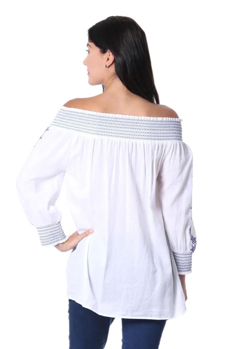 Made of snow white cotton and decorated with intricate blue embroidery performed in the Moroccan style, this off-the-shoulder tunic is fun and flirty. Indian artisan Sandip Agarwal creates this long tunic, featuring an elastic band that hugs the shoulders and chest.