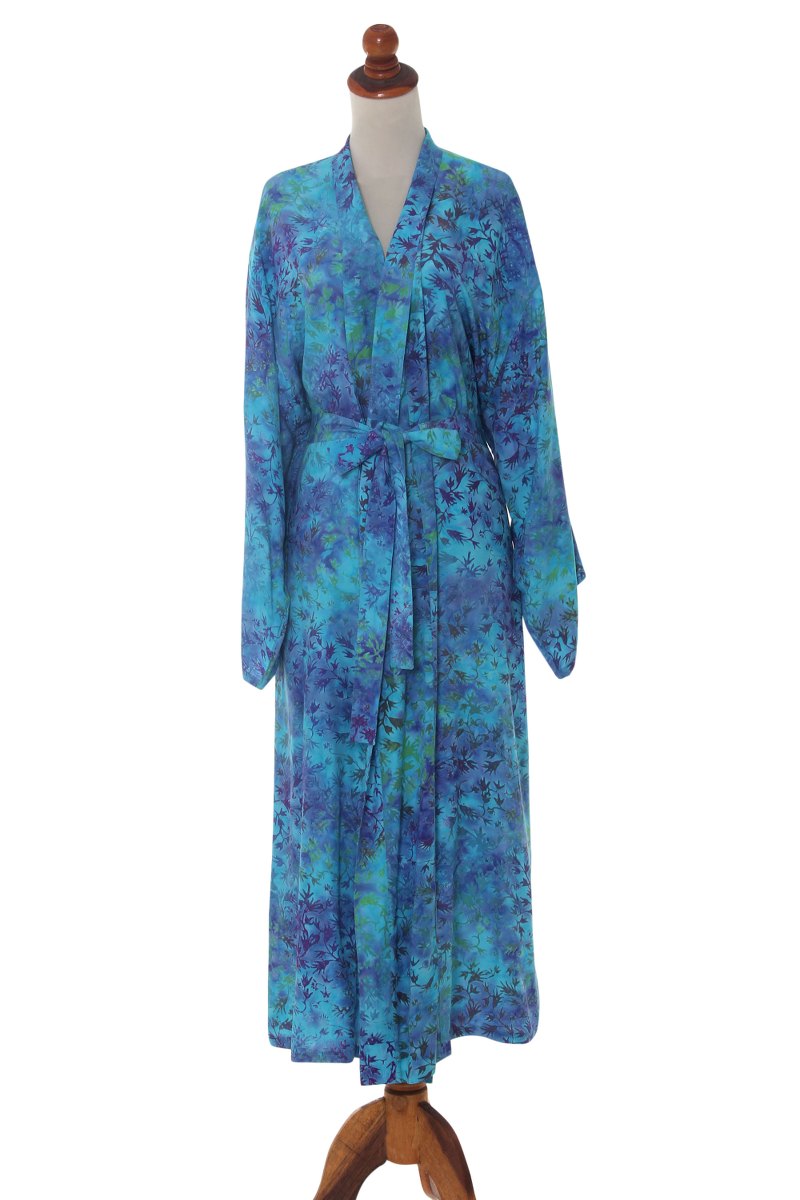 Using traditional batik methods, Bali artisan Desak Nyoman Parwati creates this pretty women's robe. The leafy patterns are created by hand-stamping on a tied-dyed background. In cool blues and greens, the long-sleeved wrap robe features a generous fit and a self-belt.