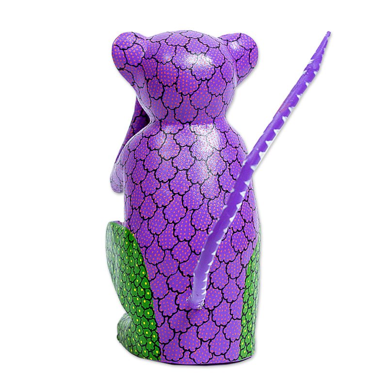 I don't know what this monkey is thinking, but I bet his mother taught him to be discreet. This sculpture is an example of a Oaxacan alebrije, a copal wood carving hand-painted in various bright colors and intricate patterns. This monkey is the work of Jesus and Roxana Hernandez, noted alebrije carvers whose work has won awards and media attention. The slender tail is removed for shipping.
