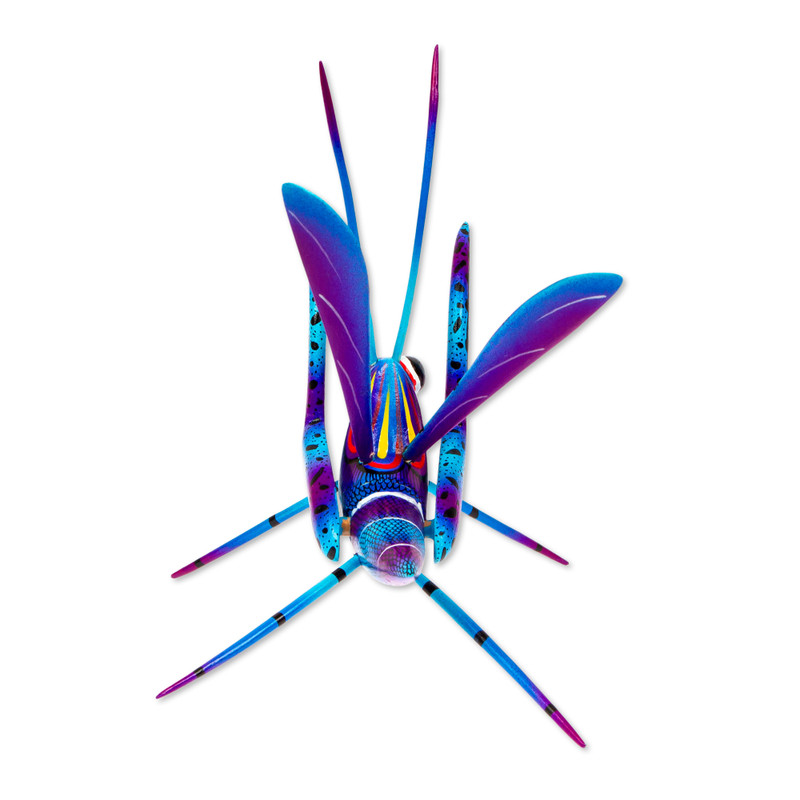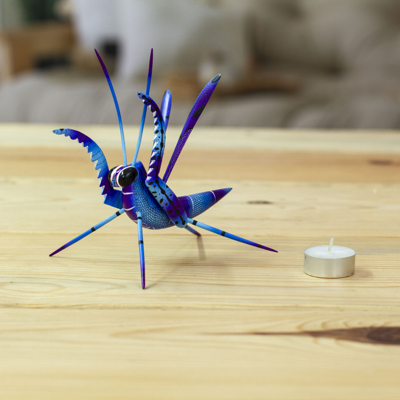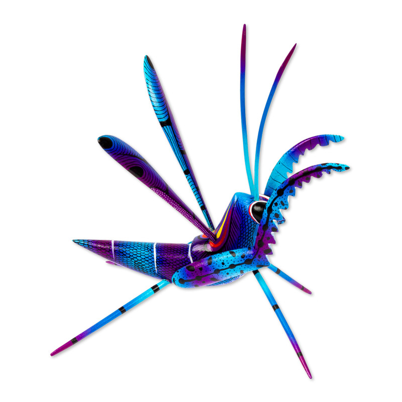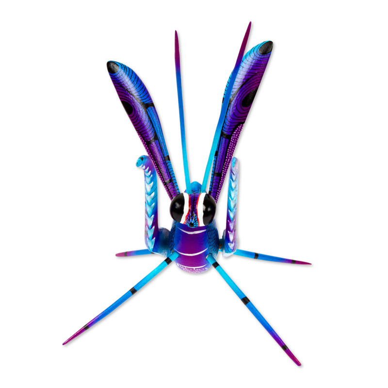 Drawing inspiration from everything that surrounds them, Mexican duo Pablo and Lucy Mendez work together to carry on the style of traditional alebrije sculptures. They give good luck wishes with this charming cricket, handcrafted of copal wood with various intricate parts that assemble together. The cricket is finished with a hand-painted design in tones of blue and purple. Small parts are separated for shipping to protect from breakage.