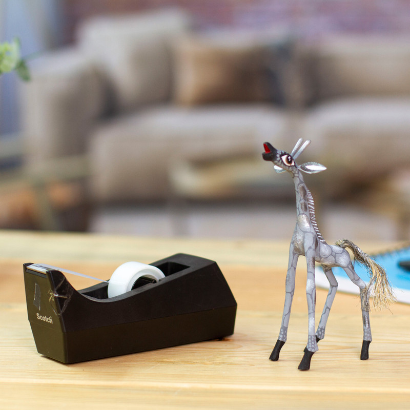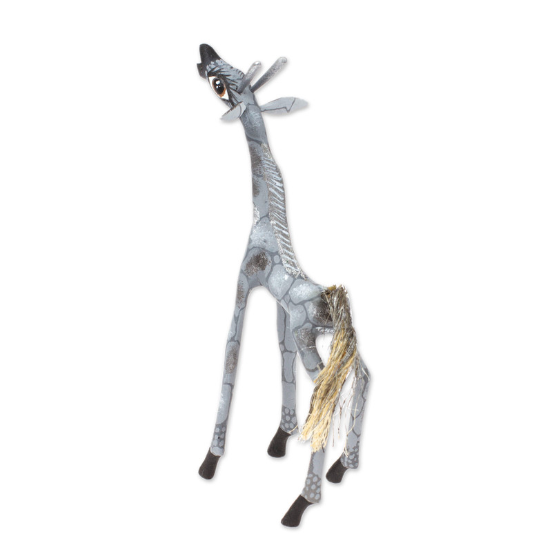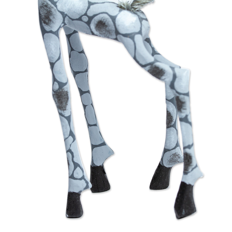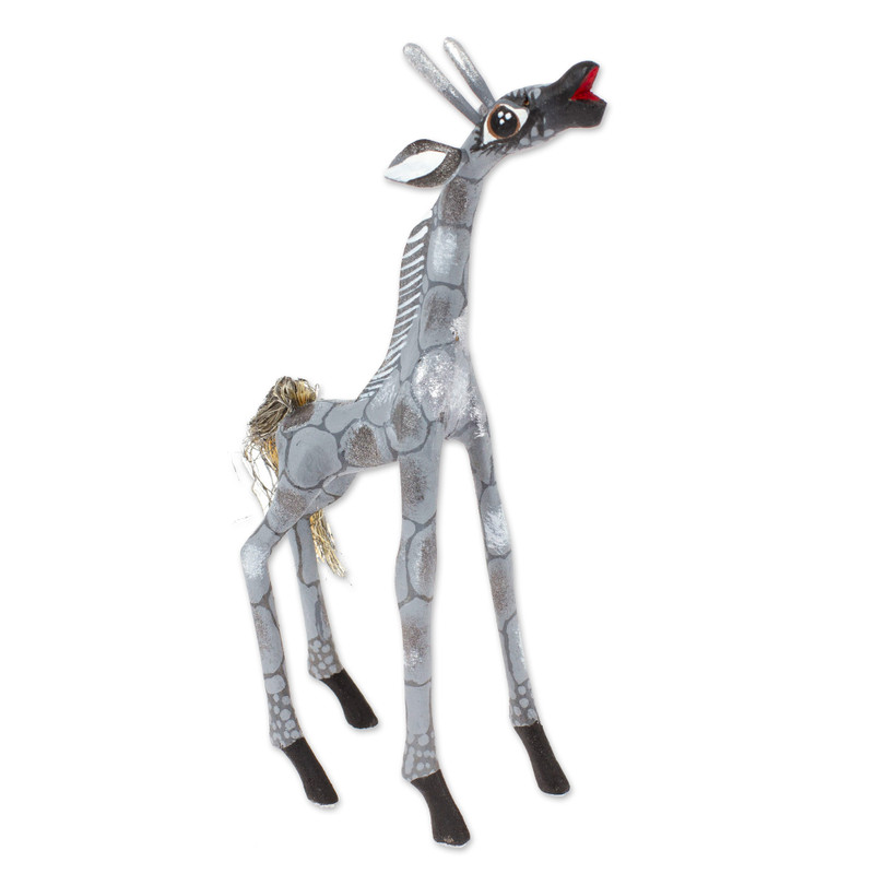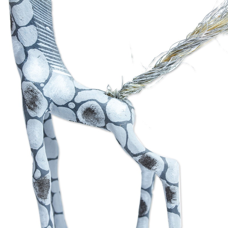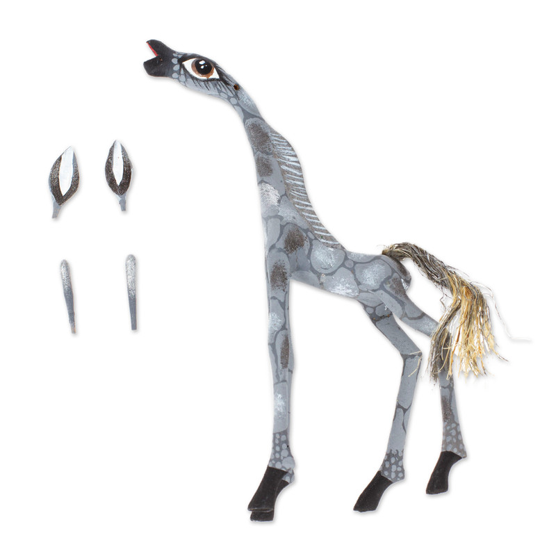 Hand-painted with pearl motifs in tones of grey, a curious little giraffe brings the magnificence of Mexican folk art to your home. Zeny and Reyna hand-carve this alebrije figurine of copal wood, complete with a tail made of maguey fiber. Small parts are separated for shipping to protect from breakage.