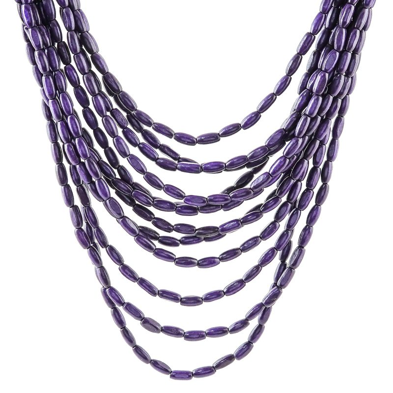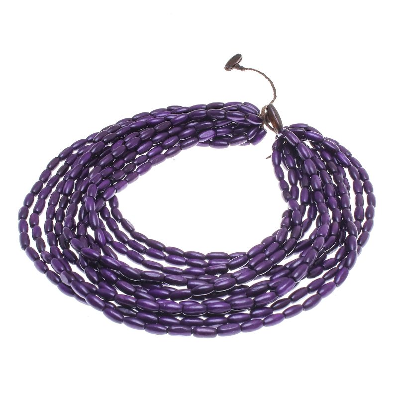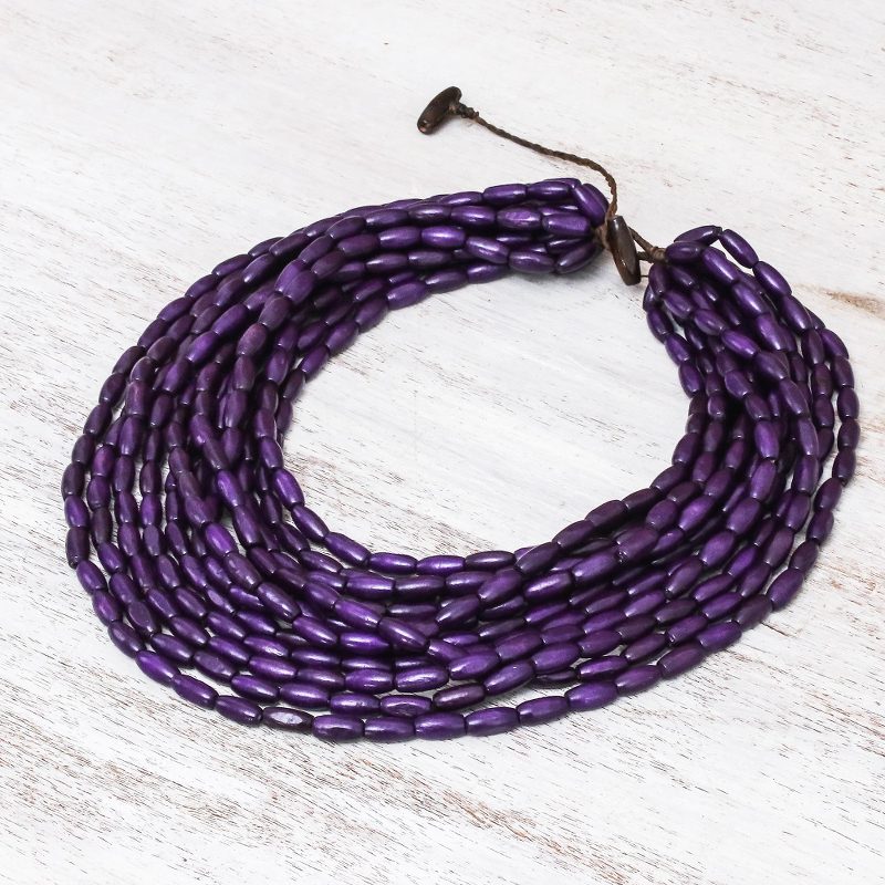 Cute and charming, this Thai necklace adds a boho touch to any wardrobe. Sumalee Nawakul creates this necklace, which circles the neck with nine strands of haldu wood beads in blue-violet. This necklace closes with a wood button clasp.