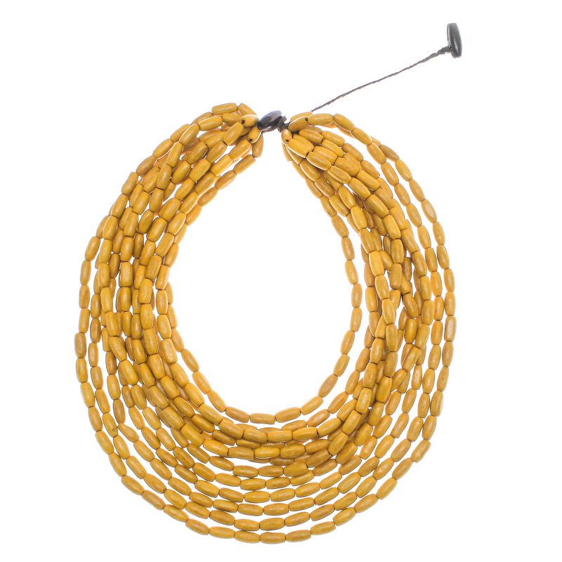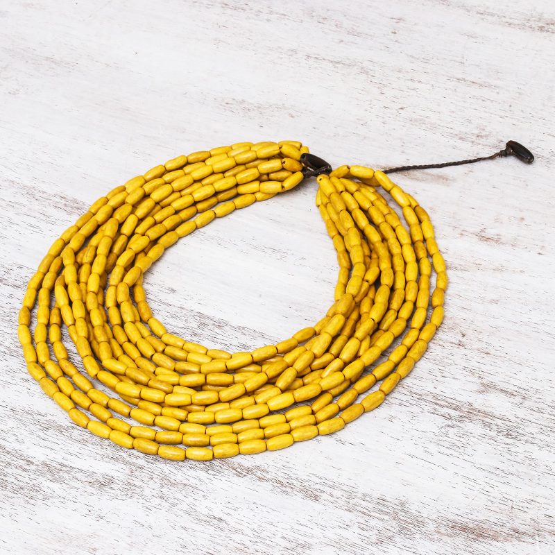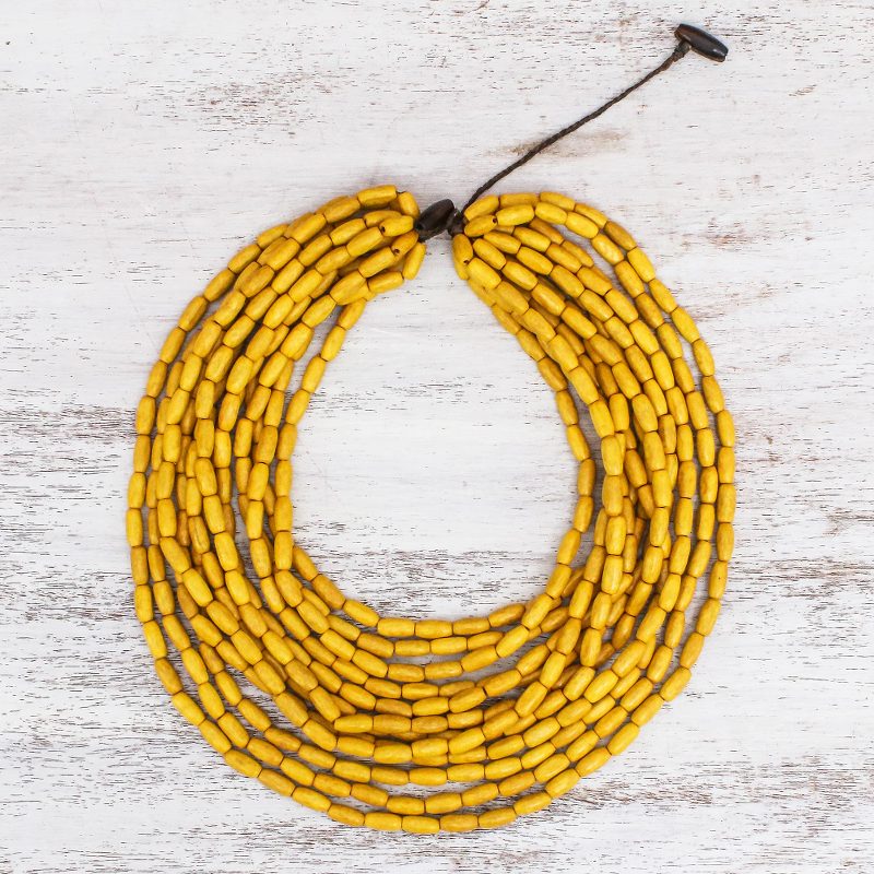 Backed by our 100% Happiness GuaranteeCute and charming, this Thai necklace adds a boho touch to any wardrobe. Sumalee Nawakul creates this necklace, which circles the neck with nine strands of haldu wood beads in maize. This necklace closes with a wood button clasp.