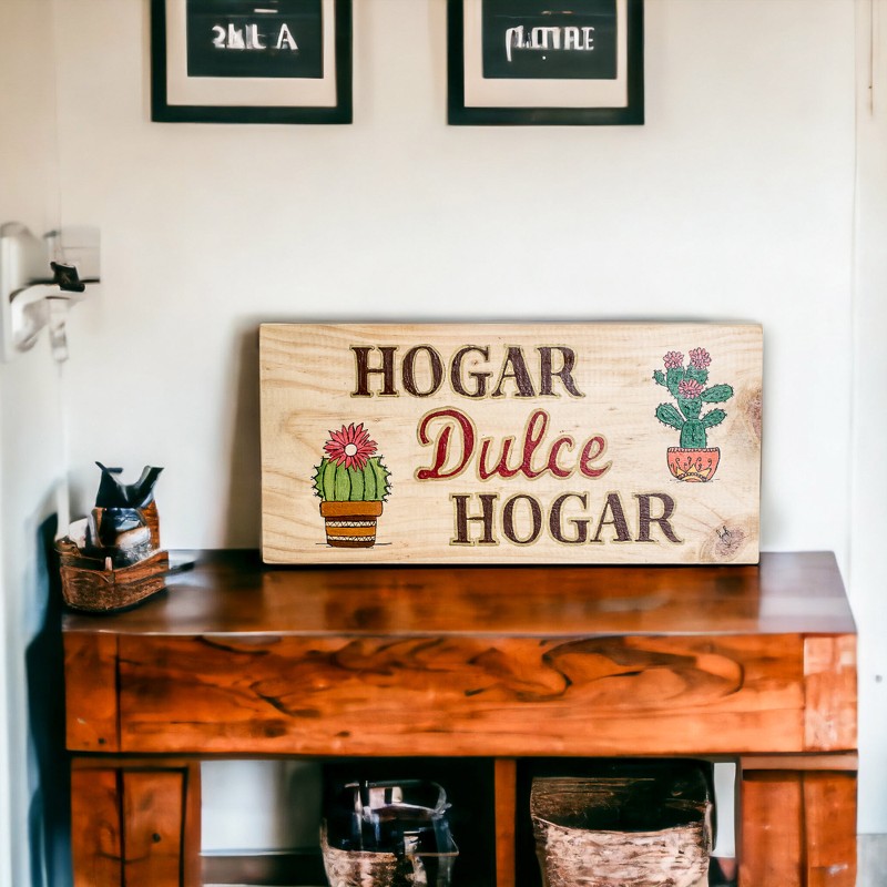 Backed by our 100% Happiness GuaranteePay homage to your beloved home with Jessica Brenes' uplifting wall art, expertly handcrafted from pinewood in Costa Rica. It displays the message: "Home sweet home" in Spanish, accompanied by lovely hand-painted flowering cacti motifs. With a practical brass hanger, you can effortlessly display this delightful decorative accent that is also a constant reminder of the warmth and joy a home can bring.