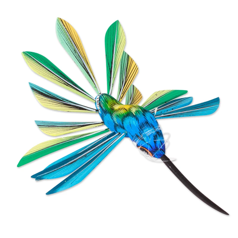 This extraordinary hanging alebrije sculpture adds a touch of Mexican folk art flair to your space. Expertly hand-carved from copal wood and lovingly hand-painted with a vibrant color palette, this playful hummingbird designed by Zeny and Reyna comes with a cord for hanging and is ready to brighten your environment as it soars overhead. Small parts are separated for shipping to protect them from breakage.