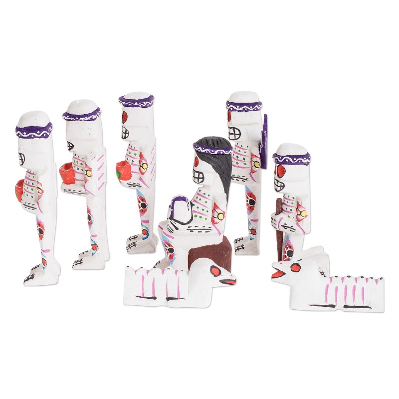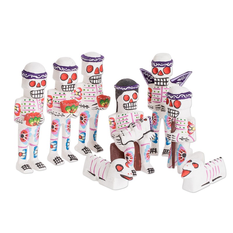 This highly unusual nativity scene set features the typical personages — Mary, Joseph, Jesus, Wise Men and angel, but all depicted as skeletal figures a la Day of the Dead. They are created by Juan and Carolina of Chichicastenango, Guatemala from pinewood and hand-painted.