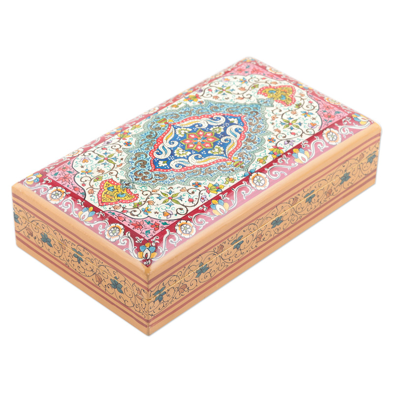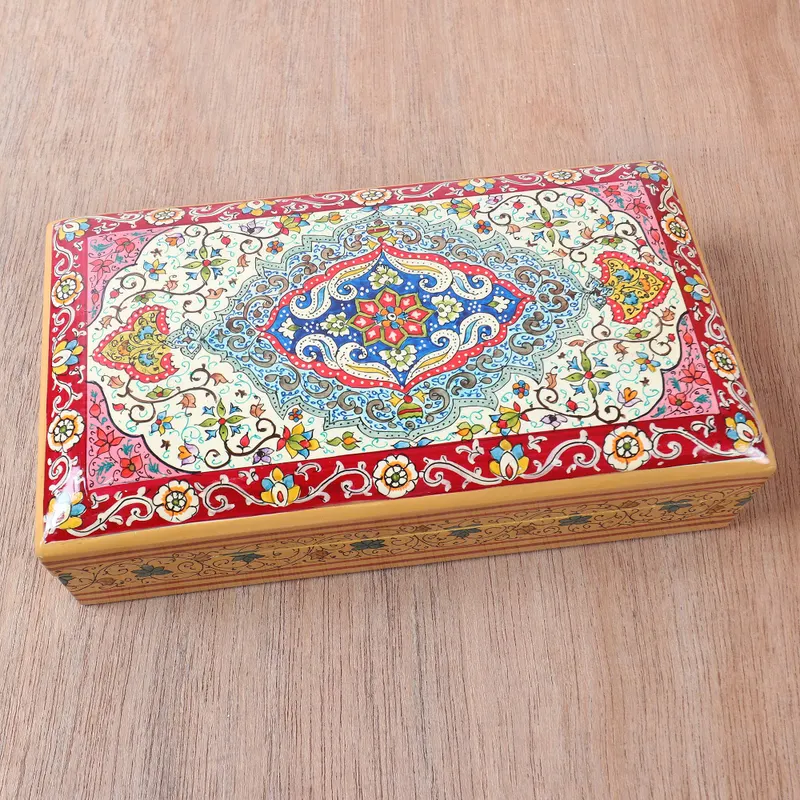 Indian artisan Niyaz uses papier mache over local kail wood craft this unique box reminiscent of a Persian carpet. Featuring floral details, this alluring wood decorative box is meticulously hand-painted in miniature style in a bright multicolor palette.