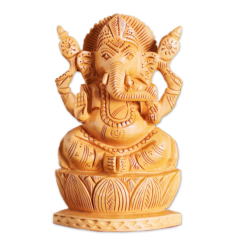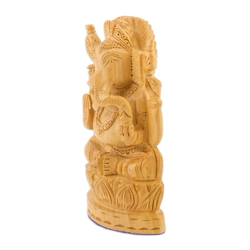 The son of Shiva and Parvati, two of the most powerful deities in Hindu belief, Ganesha is the remover of all obstacles. He is invoked before any auspicious event. This beloved god with the head of an elephant appears in a kadam wood carving from Suresh and Devender Garg. The details are realistic and beautiful.