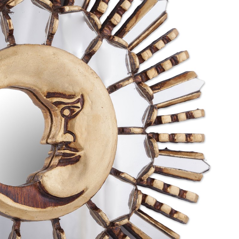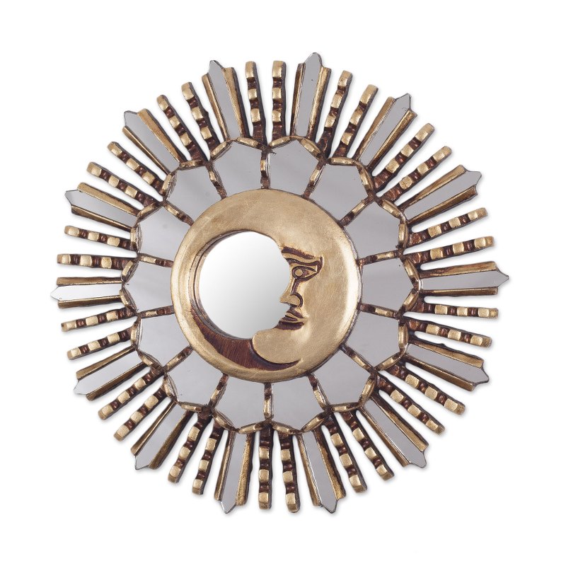 Jealous of the sun's radiance, the crescent moon tries to take center stage. Gliseria Soto of Peru presents a magnificent wall mirror, crafted by hand of mohena wood and embellished with bronze leaf. The numerous mirror panes that make up the sun's rays and inner frame reflect light brilliantly wherever you display it.