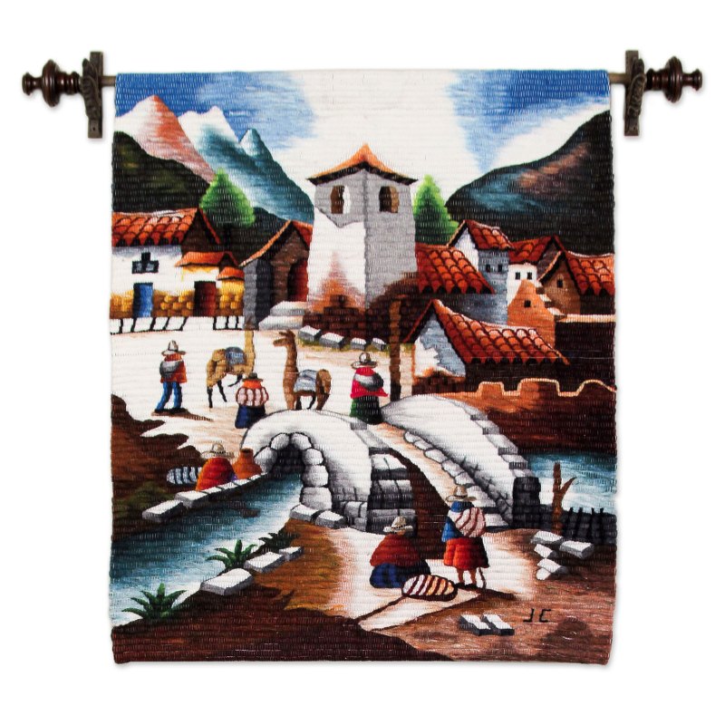 A small village is hedged by the sharp peaks of the Andes mountains. The sleepy town is even more isolated from outside contact by its solitary bridge of entry. Farmers and herders trek across the narrow bridge daily, heading to work in the fields or to tend their flocks. Inspired by their children and the breathtaking Andean landscape, the Cárdenas Brothers weave this beautiful tapestry from virgin wool.
