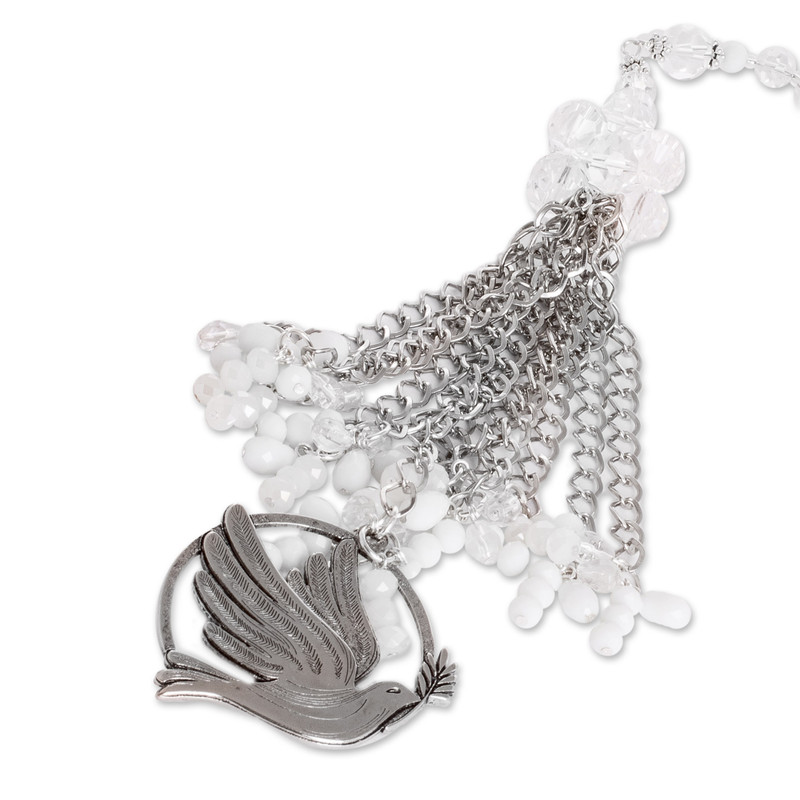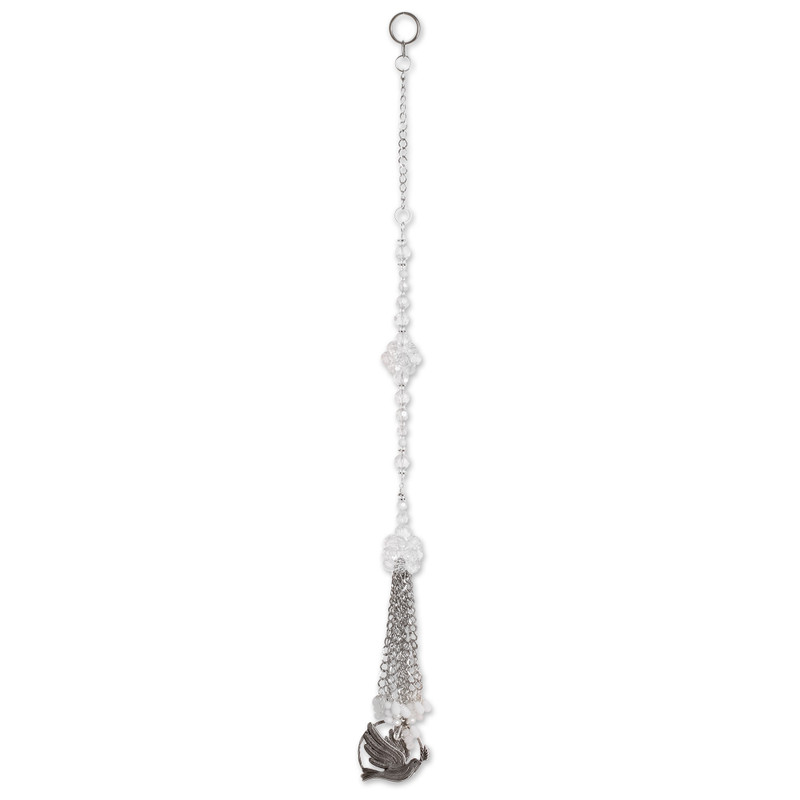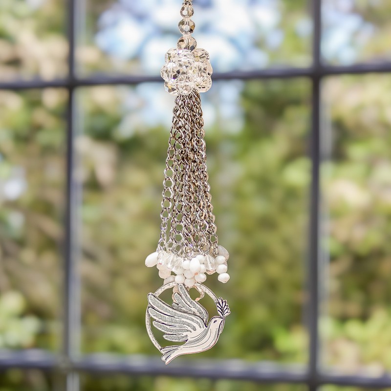 The artisan handcrafts this stunning suncatcher from crystal, glass and pewter beads, stainless steel ring and wire, nickel chains and a zinc dove pendant.
