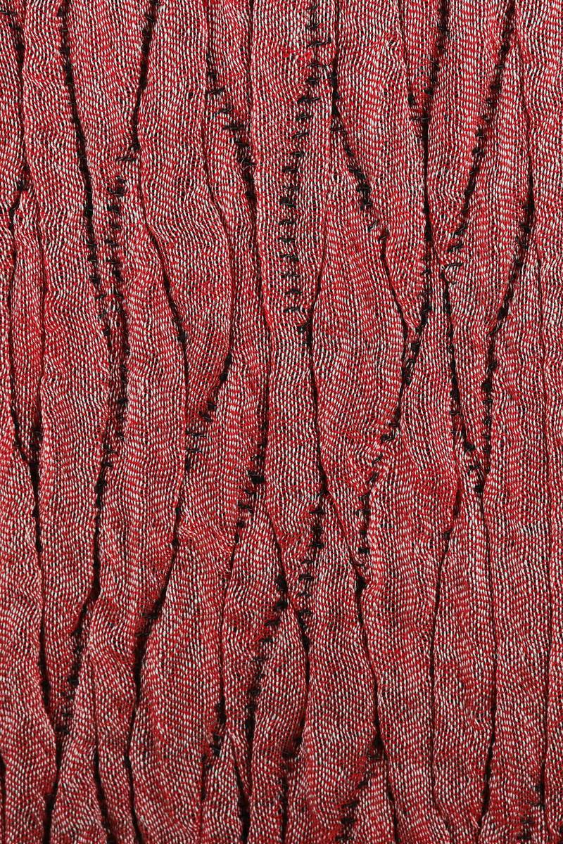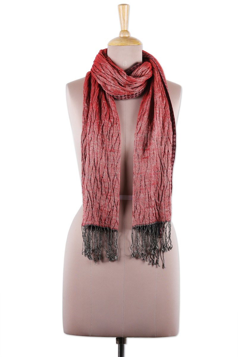 Backed by our 100% Happiness GuaranteeRich red and black hues masterfully intertwine in this stylish scarf, creating a captivating wavy texture that turns heads. Woven from a wool, silk and spandex blend, the subtle shine on the fabric adds a touch of elegance and sophistication to the fringed design, catching the light as you move. Soft and cozy, this accessory presented by India's Sandeep Malhotra is the perfect companion for every occasion.