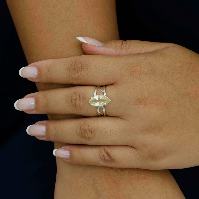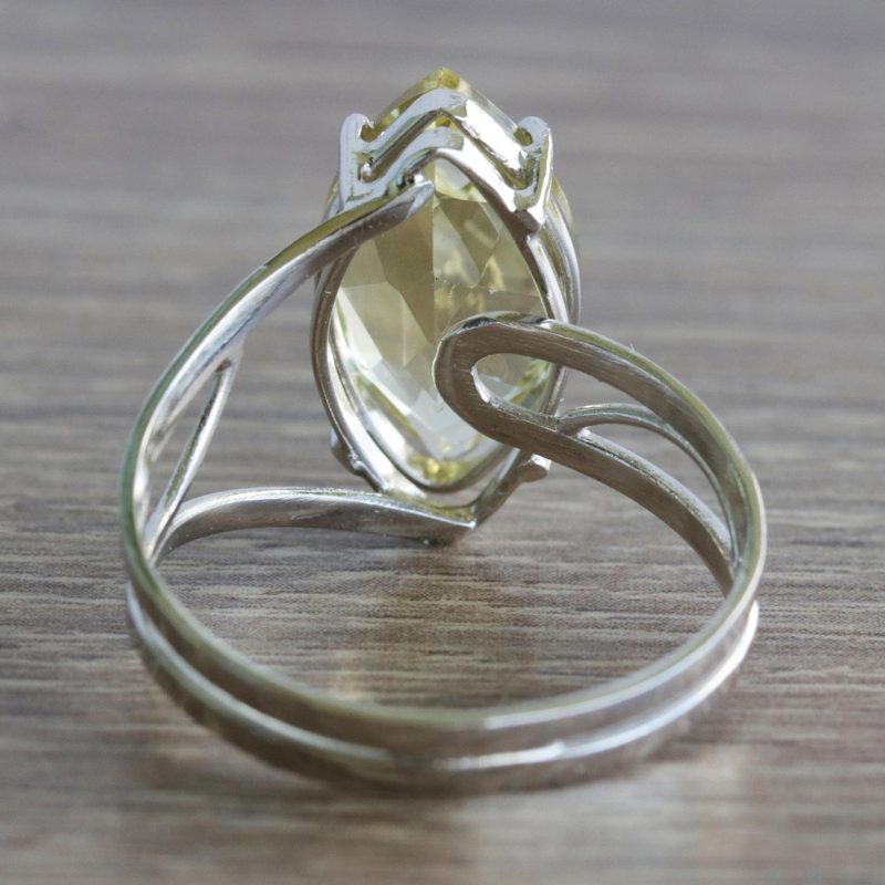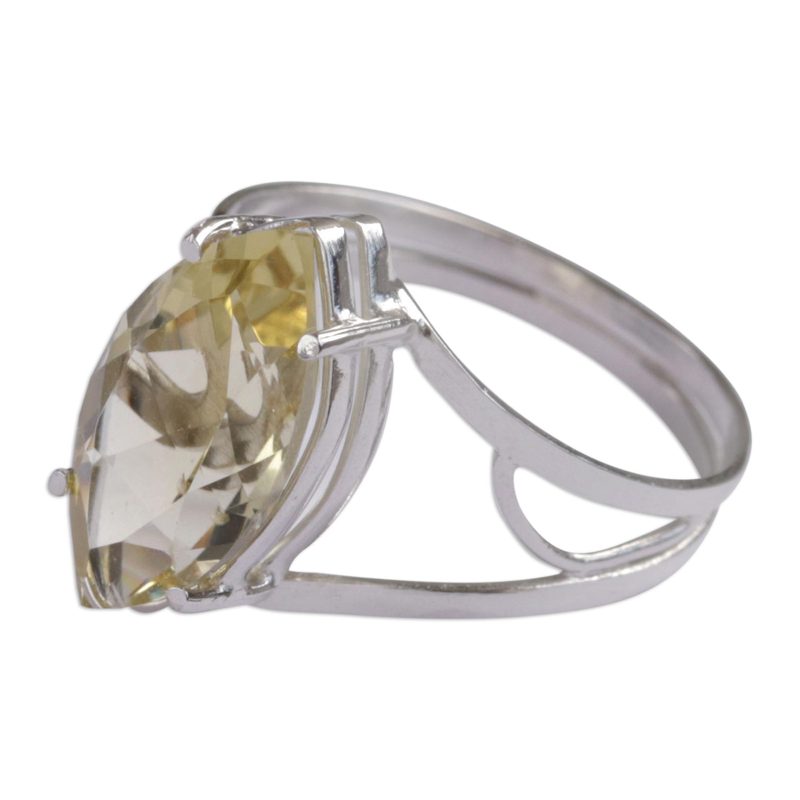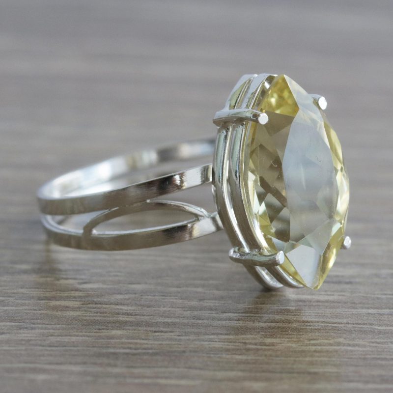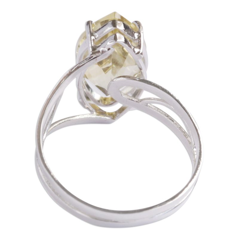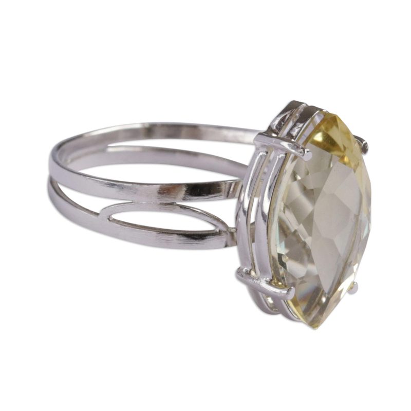 A four-carat marquise lemon quartz gemstone distinguishes this solitaire ring from Liliam Vivan in Brazil. The artisan sets the stone in a polished sterling silver basket setting atop a wrap-style band.