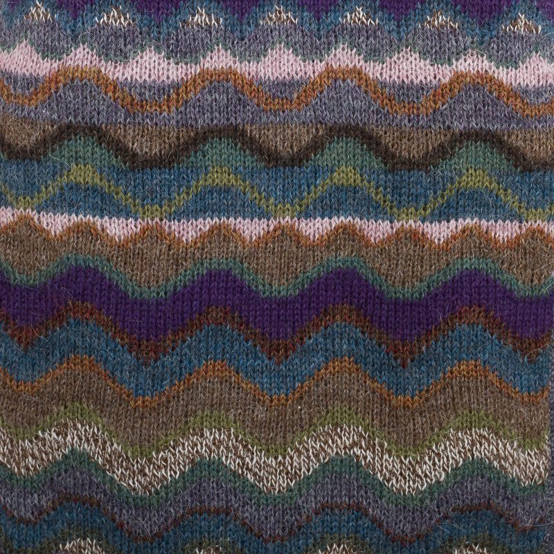 Ana Fernandez in Peru was inspired by the Montaña de Siete Colores or "Mountain of Seven Colors" in the Andes in the creation of this beautiful scarf. The mountain's mineralogical composition results in colorful stripes and streaks, drawing tourists from far and wide. The scarf is knit of soft, warm 100% alpaca wool in subtle shades of cadet blue, violet, teal and spice.
